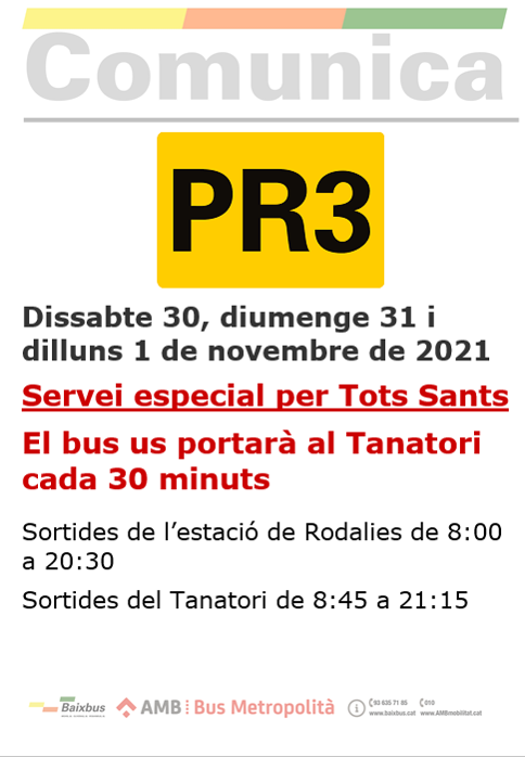 A partir de dissabte 30 d'octubre i fins dilluns 1 de novembre de 2021, servei especial de bus al Tanatori del Prat de Llobregat. Tal i com s'indica:
