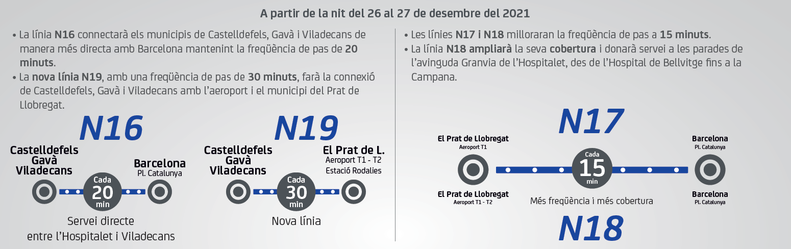 15/12 - Castelldefels - Gavà - El Prat de Llobregat - Sant Boi de Llobregat - Viladecans - Barcelona - L'Hospitalet de Llobregat: L80 - L86 - N16 - N17 - N18 - E86 Millores a la xarxa de bus metropolità