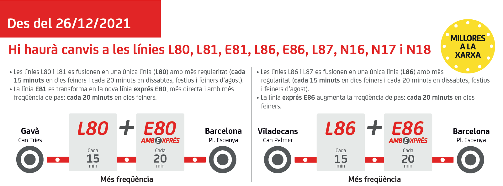 A partir de diumenge 26 de desembre de 2021 les línies L80, E80, L86, E86, N16, N17, N18 i N19 milloren el servei augmentant les freqüències de pas i ampliant la cobertura. Tal i com s'indica a continuació: